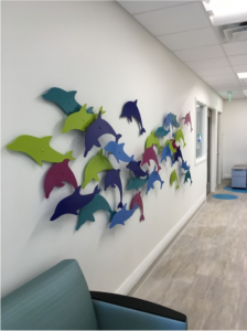 Custom-made wall sculptures add whimsy and fun and become a focal point to a corridor. For pediatric art, it is important to design pieces that invite participation. Questions such as: How many dolphins can you count? Do dolphins travel in pods? Where do you think these dolphins are going? Questions such as these help to open up conversations between patients and caregivers, which is an important aspect of healing.
