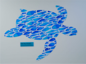 Large acrylic turtles and dolphins were created with the idea of physical therapy in mind, promoting movement by providing a goal for patients to reach during walks in the hallways. Each piece is also accompanied by facts about that animal for a more intellectually enriching experience.