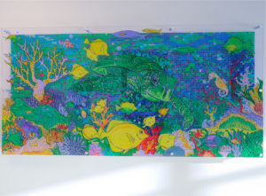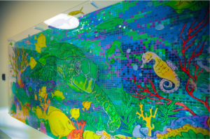 The Sea Turtle Stories wall was created as a destination, where children could spend some time looking at each turtle. Different details can be found within each image (tiny fish, a whale’s face, a mermaid tale, etc). This opens the door for conversation with patients, which could give the staff information about the patient’s well-being. Using their imagination through interaction with pieces such as this can help them to voice their feelings or whatever it is bothering them.