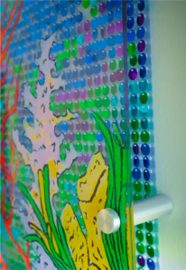 The coral bowls were designed for the NICU to present a sophisticated piece of artwork that offered a reflective moment for adults while still feeling light and airy for children. Acrylic fronts protect the pieces from harm from curious hands or wayward carts or beds. This example depicts an engaging approach to creating dynamic visual art installations that are accessible to a variety of ages, from children to adults.