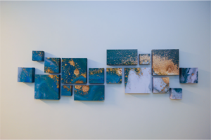 In this waiting room, primarily used by parents awaiting word on their child, the piece was created by a local artist who had to change how she created art when her husband developed a condition that made him severely allergic to chemicals, including paint. Her new medium is torn paper cut in very small pieces resulting in textured art that is so stunning up close and from a distance just dances on the wall. This allows for a visual texture as well as an opportunity for viewers to connect with the artist and the struggles she has faced; allowing the human experience to establish a helping connection.