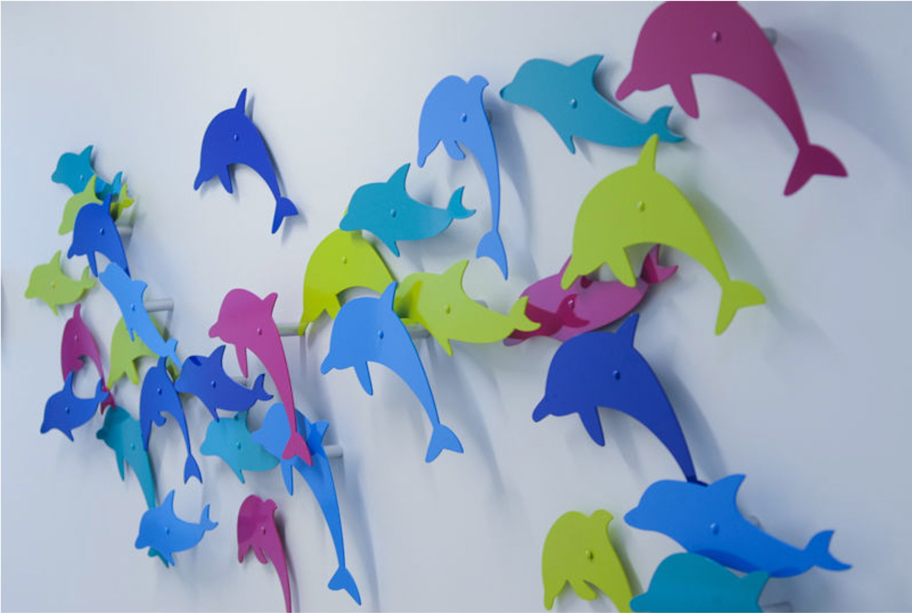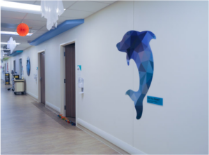 Custom-made wall sculptures add whimsy and fun and become a focal point to a corridor. For pediatric art, it is important to design pieces that invite participation. Questions such as: How many dolphins can you count? Do dolphins travel in pods? Where do you think these dolphins are going? Questions such as these help to open up conversations between patients and caregivers, which is an important aspect of healing.