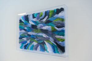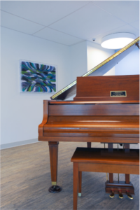 In this waiting room, primarily used by parents awaiting word on their child, the piece was created by a local artist who had to change how she created art when her husband developed a condition that made him severely allergic to chemicals, including paint. Her new medium is torn paper cut in very small pieces resulting in textured art that is so stunning up close and from a distance just dances on the wall. This allows for a visual texture as well as an opportunity for viewers to connect with the artist and the struggles she has faced; allowing the human experience to establish a helping connection.