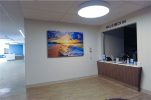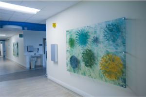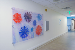 The coral bowls were designed for the NICU to present a sophisticated piece of artwork that offered a reflective moment for adults while still feeling light and airy for children. Acrylic fronts protect the pieces from harm from curious hands or wayward carts or beds. This example depicts an engaging approach to creating dynamic visual art installations that are accessible to a variety of ages, from children to adults.