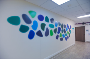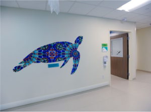 The Sea Turtle Stories wall was created as a destination, where children could spend some time looking at each turtle. Different details can be found within each image (tiny fish, a whale’s face, a mermaid tale, etc). This opens the door for conversation with patients, which could give the staff information about the patient’s well-being. Using their imagination through interaction with pieces such as this can help them to voice their feelings or whatever it is bothering them.